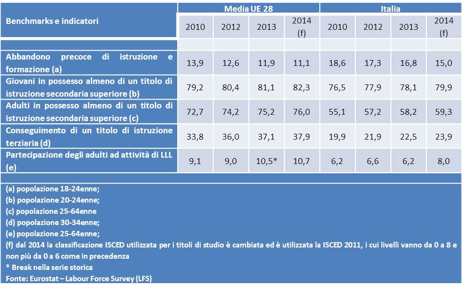 Circa 11 giovani europei su 100 abbandonano precocemente il sistema di istruzione e formazione; il tasso di conseguimento di un titolo di istruzione secondaria superiore si attesta nel 2014 all’82,3%, ancora al di sotto dell’obiettivo del 85% fissato dalla Strategia di Lisbona 2010.